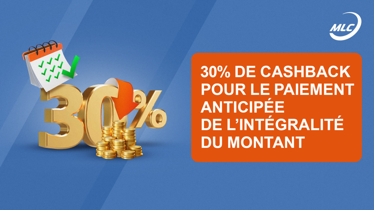 30 % de cashback pour le paiement anticipée de l’intégralité du montant du pack