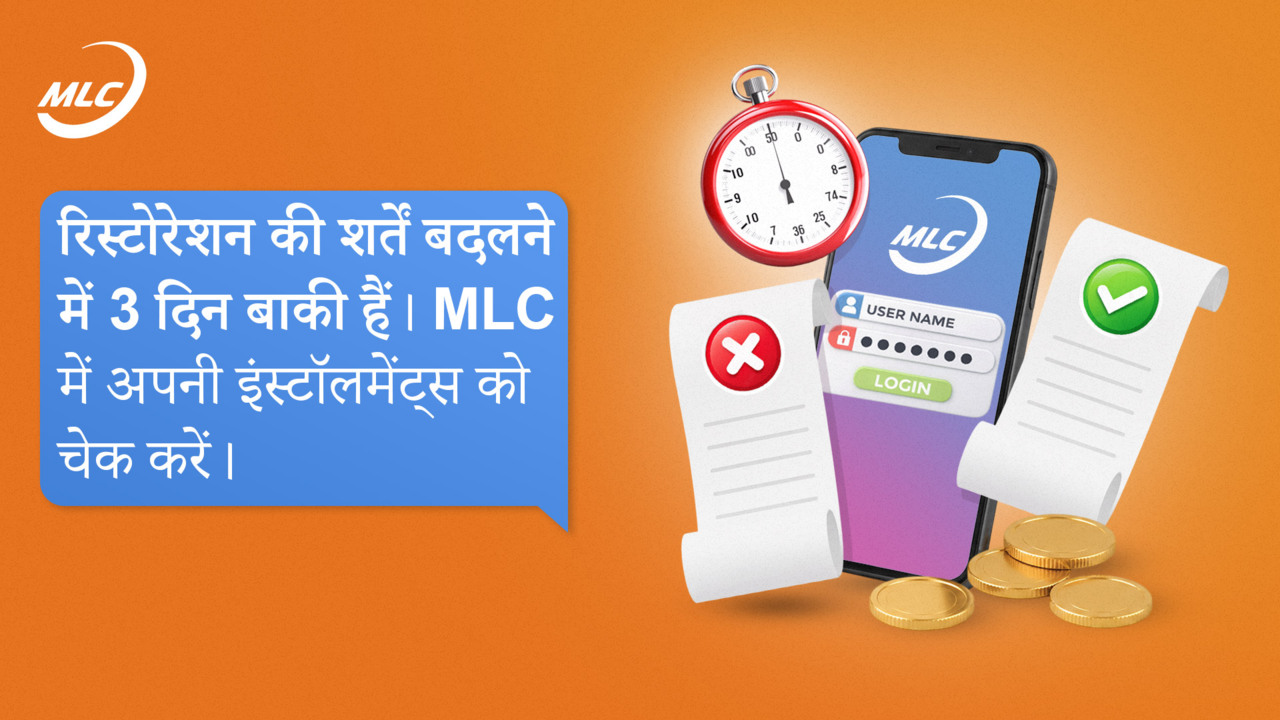 रिस्टोरेशन की शर्तें बदलने में 3 दिन बाकी हैं। MLC में अपनी इंस्टॉलमेंट्स को चेक करें।